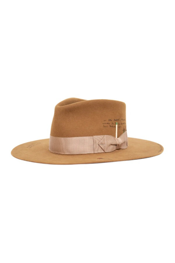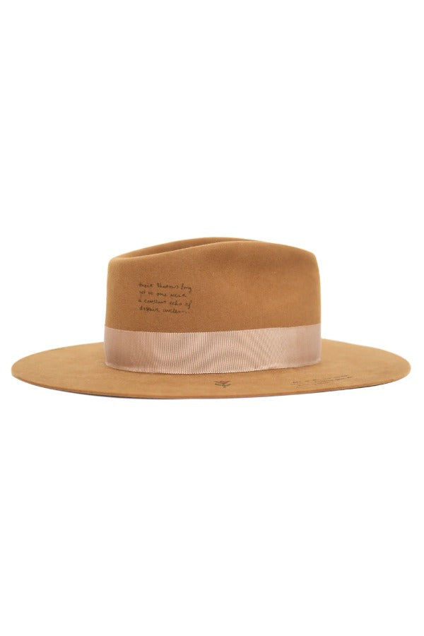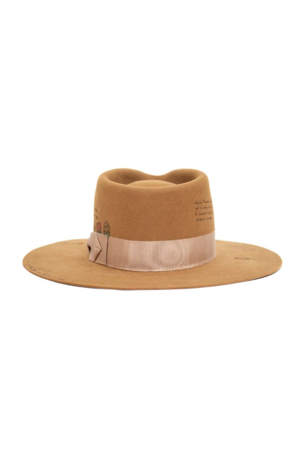 Nick Fouquet Santa Fe Felt Hat is part of the Fall 25 Collection. The Santa Fe Felt Hat is crafted from luxurious baby suede dress-weight felt, offering a refined yet durable accessory for discerning wearers. Featuring a 1 1/2” tonal grosgrain band and bow, it exudes understated elegance while maintaining a classic silhouette. What sets this hat apart are the intricate floral illustrations and subtle poetry detailed throughout, adding a unique artistic dimension that elevates its style. Perfect for those who appreciate finely made, statement-making headwear, this hat blends traditional craftsmanship with creative expression for a versatile, timeless addition to any wardrobe.