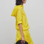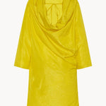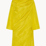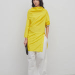 INFO Asymmetrical draped top in crushed silk taffeta with v-shaped silhouette, wide draping collar with open back neckline, and side vent with horn button closures. |