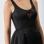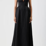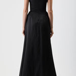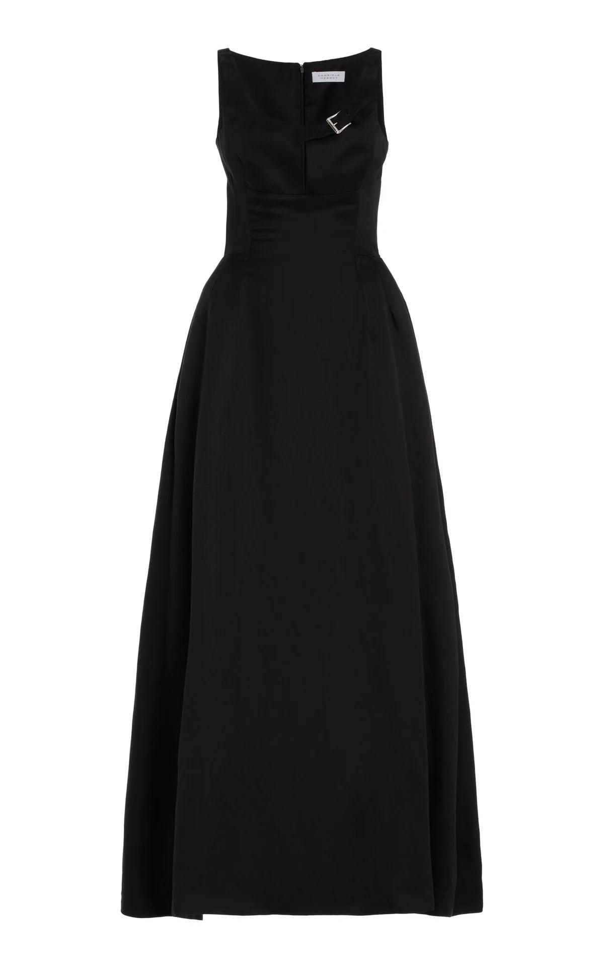 The Sven dress in silk linen satin is complete with a signature front buckle and bar detail closure: fitted through the bodice and sharply defined at the waist. In contrast the sculpted hip shape flows gently in a soft sweep to the hemline.