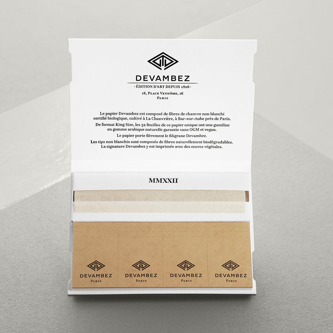 SPECIFICATIONS One booklet has 32 King Size leaves. 9.8 x 5.3 cm (3.86 x 2.08 in) and 32 tips. Our organic hemp paper with the Devambez watermark is the result of an exclusive collaboration with JOB de Jean Bardou, established in 1838. The tips are naturally biodegradable and unbleached. The Devambez signature is printed with vegetable inks on the tip.