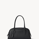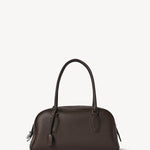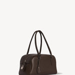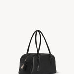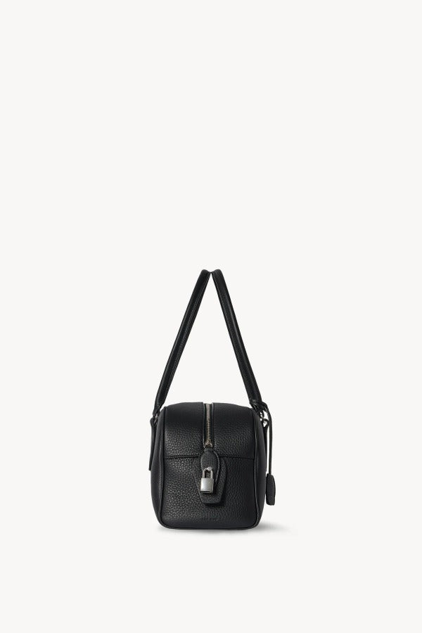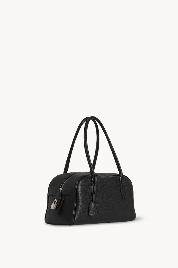 The Row E/W India Bag in Lux Grain Leather is part of the Winter 25 Collection. Bowling bag in textured calfskin leather with elongated silhouette, extended tubular handles, piping, branded metal padlock and key, and top zipper closure. Minimally finished, the natural grain surface is left intact, giving the leather a supple hand and refined texture that develops character over time.