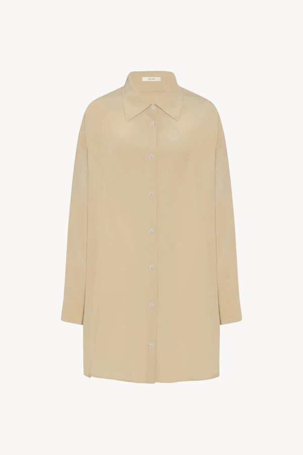 The Row Luka Shirt in Silk is part of the Winter 25 Collection. Oversized button-up shirt in structured silk crepe with straight hem and exposed front placket with mother-of-pearl buttons.