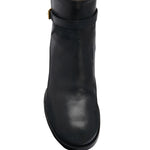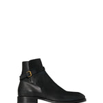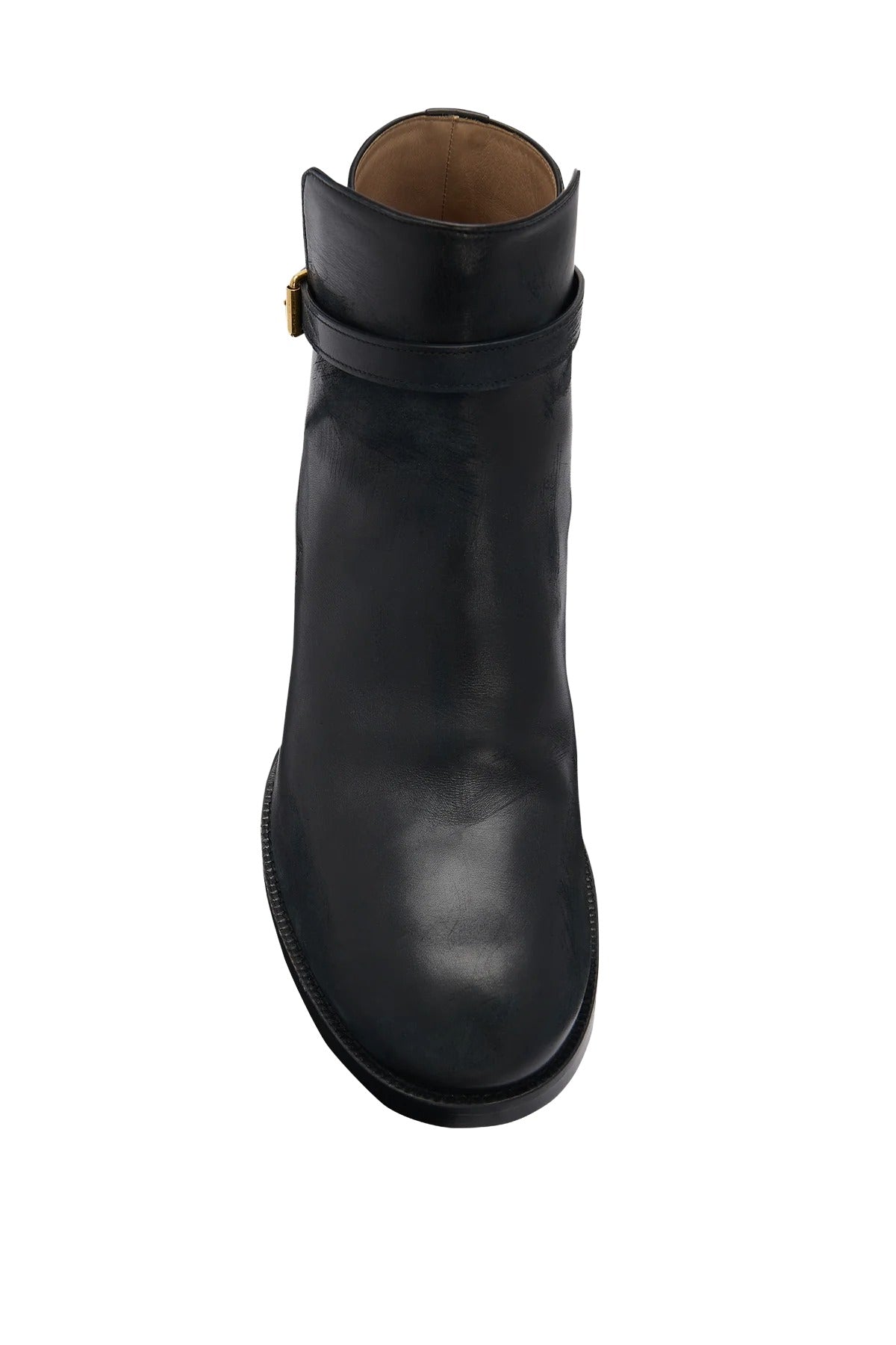 The Row Nobilis Buckle Bootie is part of the Winter 25 Collection. Streamlined ankle boot in oiled distressed leather with oval toe, ankle strap with metal buckle, and stacked leather heel.