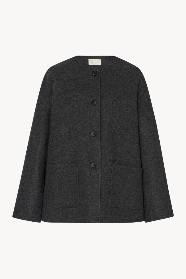 The Row Quintus Double Face Jacket in Cashmere is part of the Winter 25 Collection. Handcrafted collarless jacket in lightweight double-faced cashmere with dropped shoulders, front patch pockets, and horn button closure.