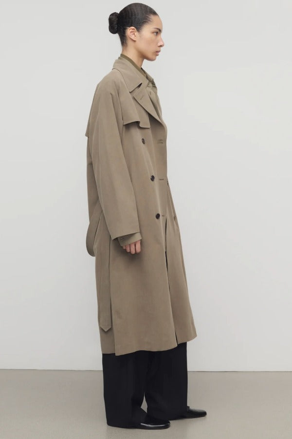 The Row Rhydian Coat is part of the Fall 25 Collection. Oversized double-breasted trench coat in refined silk and wool suiting with slant welt pockets, horn button closure, and removable buckle belt.