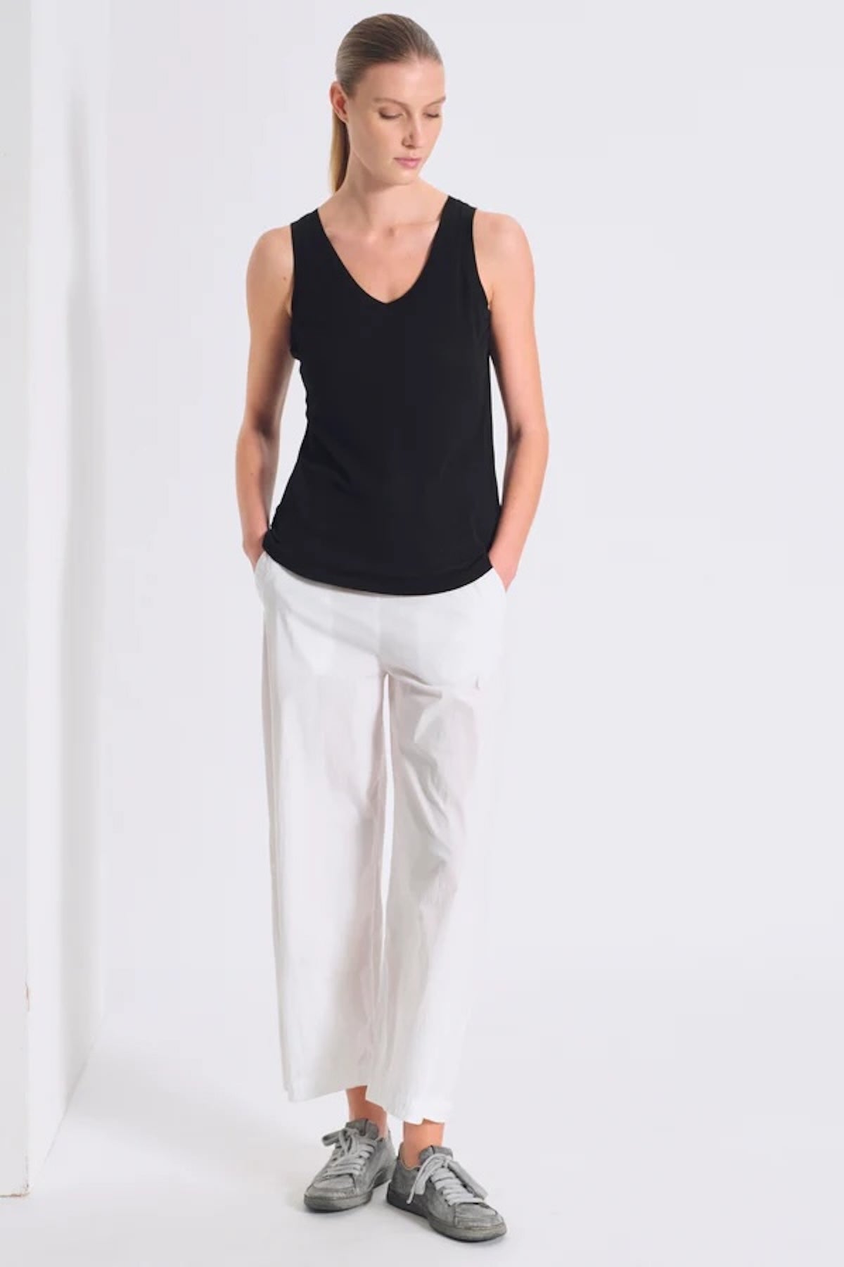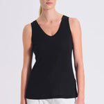 Slim-fit cotton crepe jersey tank top with a deep v-neck and contrasting fabric on the collar and armholes. Garment dyed.