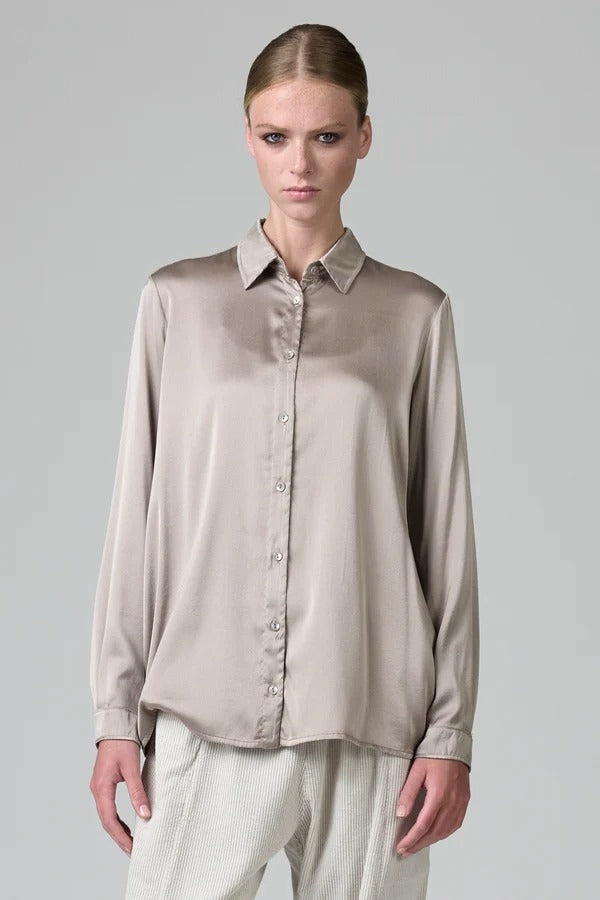 Transit Stretch Silk Satin Regular Fit Shirt is a regular-fit shirt, made of stretch silk satin. Italian collar, buttoned cuffs, and back yoke. Garment-dyed.